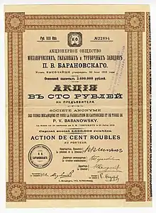 Акционерное общество механических, гильзовых и трубочных заводов П. В. Барановского было зарегистрировано в 1912 г. в Санкт-Петербурге (Устав Высочайше утвержден 30 июля 1912 г.) на базе основанного там же в 1877 г. двоюродными братьями, П. В. и В. С. Барановскими завода для производства артиллерийских трубок (взрывателей) и патронных гильз (сейчас это ОАО «Компрессор»).