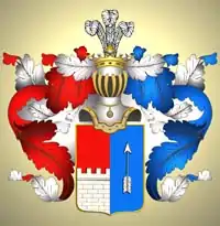 Щит, разделённый перпендикулярно на два поля, красное и голубое, из коих в первом находится серебряная городская стена с четырьмя зубцами, во втором голубом поле серебряная же стрела, вверх летящая.