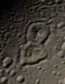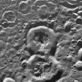 ![]() Кратер Аладдин — в центре. Ниже видно кратер Али-Баба, а выше и правее — сильно разрушенный кратер Зайнаб. Мозаика снимков «Кассини». | |