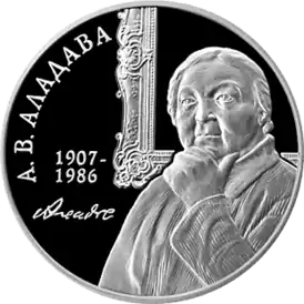 ![]() Памятная монета Республики Беларусь. «Сто лет со дня рождения Аладовой Е. В.» | |
