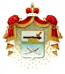 Щит разделён горизонтально на две части, из которых в верхней части, в серебряном поле, изображена чёрная пушка на золотом лафете, поставленном на траве и на пушке сидит райская птица (титулярный герб княжества Смоленского). В нижней части видны в реке плавающие крестообразно две серебряные рыбы (титулярный герб княжества Белозёрского). Щит покрыт мантией и шапкой, принадлежащей княжескому достоинству.