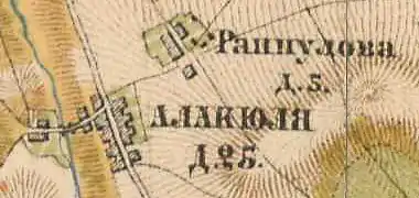 На карте профессора С. С. Куторги 1852 года она отмечена, как деревня Алакюля[10].