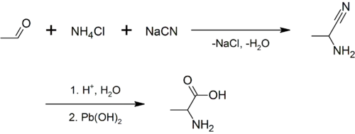Впервые аланин был синтезирован Штреккером в 1850 г. действием на ацетальдегид аммиаком и синильной кислотой с последующим гидролизом образовавшегося α-аминонитрила[2]: