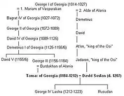 В начале XI века, аланская принцесса Альда, выходит замуж за царя абхазов и грузин Георгия I[9]. Она упоминается как «дочь царя овсов», при этом «овсы» — это грузинское обозначение алан[82]. Её имя Альда (греч. Ἀλδή) известно из современных ей византийских источников. Византийский хронист Иоанн Скилица, подкрепляя свои слова грузинскими летописями, писал, что Альда, «жена Георгия… аланской расы» сдала «очень сильную крепость Анакопию» императору, который удостоил её сына Дмитрия звания магистра[83][84]. После смерти Георгия и вступления в регентство его первой жены, при своём несовершеннолетнем сыне Баграте IV, Альда и её сын Дмитрий бежали в Византийскую империю. Дмитрий провёл почти 20 лет в попытках захватить грузинский престол, поддерживаемый в своей борьбе могущественным князем Липаритом Клдекарским и византийцами. Он умер около 1053 года. После этого, по свидетельству грузинского историка XVIII века князя Вахушти Багратиони, сын Дмитрия Давид был увезён своей бабушкой (то есть Альдой, не упомянутой по имени) в Аланию, где его потомки процветали, создав местную «царскую» линию, из которой происходил Давид Сослан.[85][86]