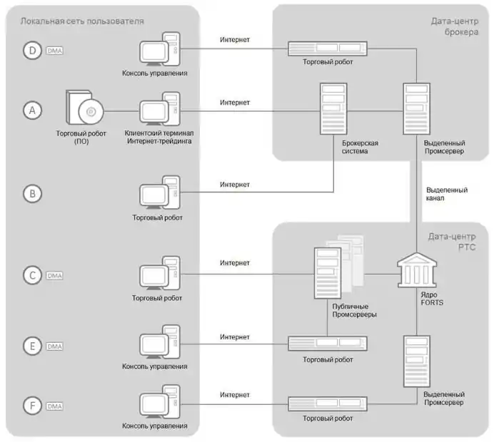 Варианты C, D, E и F относятся к группе вариантов прямого доступа к рынкам и характеризуются подключением торгового робота непосредственно к звену биржевой торговой инфраструктуры, в данном случае к промежуточному серверу (промсерверу) FORTS. В связи с минимальным количеством звеньев, DMA является оптимальным решением для алгоритмических систем высокочастотной торговли.