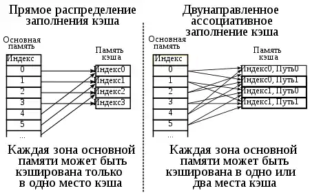Кэш прямого отображения: для высокоскоростных кэшей процессора, где не хватает быстродействия 2-канального ассоциативного кэширования. Адрес нового элемента используется для вычисления местонахождения в кэше (в отведенной для этого области). Все, что было ранее, — вытесняется.