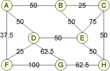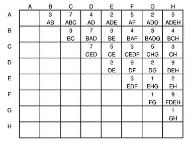 | DE | 2(ADE) + 5(ADEH) + 7(CED) + 3(CEDF) + 2(DE)+ 9(DEH) + 3(EDF)+ 9(FDEH) = 40 |