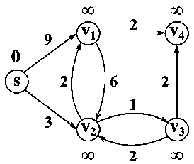 Здесь — множество вершин графа , — множество его рёбер, а — весовая функция, заданная на рёбрах графа (возвращает длину дуги, ведущей из вершины в ), — массив, содержащий расстояния от вершины до любой другой вершины.