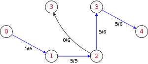 Ниже приведена симуляция алгоритма Диница. Во вспомогательной сети вершины с красными метками — значения . Блокирующий поток помечен синим.