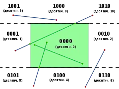 Алгоритм разделяет плоскость на 9 частей прямыми, которые образуют стороны прямоугольника. Каждой из 9 частей присваивается четырёхбитный код. Биты (от младшего до старшего) значат «левее», «правее», «ниже», «выше». Иными словами, у тех трёх частей плоскости, которые слева от прямоугольника, младший бит равен 1, и так далее.