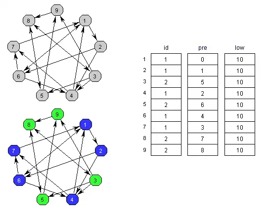 Индексы компонент связности всех вершин хранятся в векторе id, индексированном номерами вершин. Вектор low отслеживает вершину с наименьшим номером в прямом порядке обхода, достижимую из каждого узла через последовательность прямых связей, за которыми следует одна восходящая связь. Воспользовавшись поиском в глубину с тем, чтобы рассматривать вершины в обратном топологическом порядке, мы вычисляем для каждой вершины v максимальную точку, достижимую через обратную связь из предшественника (low[v]). Когда для вершины v выполняется pre[v]=low[v], мы выталкиваем её из стека, а также все вершины выше её и всем им присваиваем номер следующей компоненты.