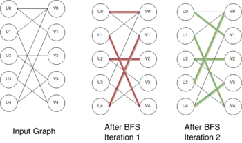 - Поиск в ширину (BFS) разбивает вершины графа на слои. BFS начинает с множества свободных вершин , которые тем самым образуют первый слой разбиения (таким образом, первый слой содержит только не покрытые паросочетанием рёбра). На последующих уровнях поиска алгоритм добавляет вершины на новый уровень, чередуя рёбра: будет попеременно добавлять вершины, связанные ребром то в паросочетании, то вне его, поэтому в процессе поиска из вершины из мы всегда будем проходить по рёбрам не из паросочетания, а если вершина из — то наоборот. Поиск прерывается на уровне , как только впервые будет достигнута хотя бы одна свободная вершина из .