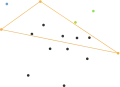 - Рассмотрим верхнее подмножество S1. Выберем точку Pi, имеющую наибольшее расстояние от прямой ЛП (треугольник ЛPiП имеет наибольшую площадь). Если таких точек несколько, выбираем ту, у которой угол PiЛП наибольший. Точка Pi является вершиной выпуклой оболочки множества. В самом деле, если через точку Pi провести прямую, параллельную прямой ЛП, то выше этой прямой не окажется ни одной точки множества S. Возможно, на построенной прямой окажутся другие точки, но, согласно сделанному выбору, Pi из них самая левая. Т. о. Точка Pi не может быть представлена выпуклой комбинацией двух других точек множества S.Построим прямые ЛPi и PiП. Точки, расположенные справа от обеих прямых, могут быть исключены из дальнейшего рассмотрения, поскольку они являются внутренними точками треугольника ЛPiП, то есть не принадлежат CH(S) — границе выпуклой оболочки.