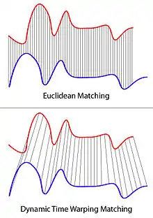 Временные ряды — широко распространенный тип данных[уточнить], встречающийся, фактически, в любой научной области, и сравнение двух последовательностей является стандартной задачей. Для вычисления отклонения бывает достаточно простого измерения расстояния между компонентами двух последовательностей (евклидово расстояние). Однако часто две последовательности имеют приблизительно одинаковые общие формы, но эти формы не выровнены по оси X. Чтобы определить подобие между такими последовательностями, мы должны «деформировать» ось времени одной (или обеих) последовательности, чтобы достигнуть лучшего выравнивания.[2]