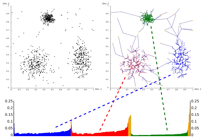 Рисунок выше иллюстрирует эту концепцию. В верхней левой области рисунка показан смоделированный набор данных. Область рисунка верху справа визуализирует остовное дерево, полученное алгоритмом OPTICS, а нижняя часть рисунка показывает график достижимости, как его получает OPTICS. Цвета на этом графике являются метками и не вычисляются алгоритмом. Однако хорошо видно, как долины на графике соответствуют кластерам приведённого набора данных. Жёлтые точки на этом изображении считаются шумом и не соответствуют никаким долинам. Они обычно не назначаются никаким кластерам, за исключением всеобъемлющего кластера «все данные» в иерархическом результате.