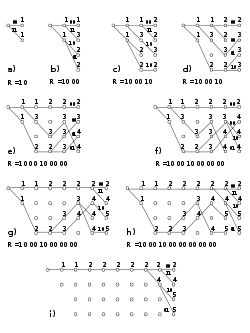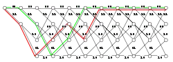 Рассмотрим работу декодера Витерби на простом примере. Полагаем, что кодирование производится с использованием сверточного (7,5)-кода. Пользуясь решетчатой диаграммой кодера, попытаемся, приняв некоторый сегмент , проследить наиболее вероятный путь кодера. При этом для каждого сечения решетчатой диаграммы будем отмечать меру расходимости пути к каждому её узлу. Предположим, что передана кодовая последовательность U = (00000000…), а принятая последовательность имеет вид r = (10001000…), то есть в первом и в третьем кадрах кодового слова возникли ошибки. Как мы уже убедились, процедура и результат декодирования не зависят от передаваемого кодового слова и определяются только ошибкой, содержащейся в принятой последовательности. Поэтому проще всего считать, что передана нулевая последовательность, то есть U = (00000000…). Приняв первую пару символов (10), декодер определяет меру расходимости для первого сечения решетки, приняв следующую пару символов (00), — для второго сечения и т. д. При этом из входящих в каждый узел путей оставляем путь с меньшей расходимостью, поскольку путь с большей на данный момент расходимостью уже не сможет стать в дальнейшем короче. Заметим, что для рассматриваемого примера начиная с четвёртого уровня метрика (или мера расходимости) нулевого пути меньше любой другой метрики. Поскольку ошибок в канале больше не было, ясно, что в конце концов в качестве ответа будет выбран именно этот путь. Из этого примера также видно, что выжившие пути могут достаточно долго отличаться друг от друга. Однако на шестом-седьмом уровне первые семь ребер всех выживших путей совпадут друг с другом. В этот момент согласно алгоритму Витерби и принимается решение о переданных символах, так как все выжившие пути выходят из одной вершины, то есть соответствуют одному информационному символу.
