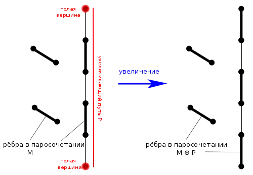 Если дан граф G=(V, E) и паросочетание M для G, вершина v голая (не покрыта паросочетанием), если нет ребра в M, инцидентного v. Путь в G является чередующейся цепью, если её рёбра попеременно не принадлежат M и содержатся в M. Увеличивающий путь P — это чередующаяся цепь, которая начинается и кончается голыми вершинами. Заметим, что число не принадлежащих паросочетанию вершин в увеличивающем пути больше на единицу числа рёбер, принадлежащих паросочетанию, а потому число рёбер в увеличивающем пути нечётно. Увеличение паросочетаний вдоль пути P — это операция замены множества M на новое паросочетание .