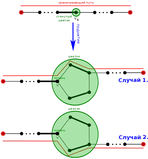 - Если мы завершаем с двумя смежными вершинами, помеченными как внешние «o», мы имеем цикл нечётной длины, а следовательно, цветок[7].