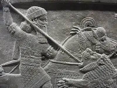 Ассирийский рельеф; царь Ашшурбанипал пронзает копьём льва