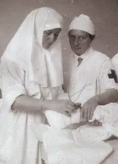В 1915 году в разгар Первой мировой войны Царскосельский госпиталь был переоборудован под приём раненых солдат. Александра Фёдоровна вместе с дочерьми Ольгой и Татьяной прошли обучение сестринскому делу у княжны Веры Гедройц, а затем ассистировали ей при операциях в качестве хирургических сестёр. Императрица лично финансировала несколько санитарных поездов[20].