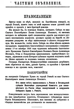 Возведён к 1900 году в память о чудесном спасении императора Александра III в железнодорожной катастрофе 17 октября 1888 года. Ещё до катастрофы, 19 февраля 1887 года, православное духовенство Ревеля подало эстляндскому губернатору князю Сергею Владимировичу Шаховскому докладную записку, которая объясняла необходимость строительства нового храма.
