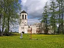 - церковь Покрова Божией Матери (не сохранилась). деревянная шатровая церковь в стиле «дивного узорочья». Сохранился только остов фундамента в форме креста[6].
