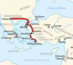В первый раз после Граника македоняне встретили сопротивление в Милете, гарнизон которого возглавлял грек Гегесистрат. Александр осадил этот город с суши, а с моря к Милету подошёл его флот, всего на несколько дней опередивший корабли персов. С помощью осадных машин македоняне разрушили крепостные стены и взяли город штурмом; персидский флот, оказавшись без запасов еды и воды, отступил[94][95]. После этого у персов осталась только одна опорная база на западном побережье Малой Азии — Галикарнас. Там укрылись Мемнон с уцелевшими греческими наёмниками, сатрап Карии Оронтобат, ряд знатных македонских эмигрантов. Со стороны моря Галикарнас защищал огромный флот в 400 кораблей. При этом царица Карии Ада поддержала Александра (некоторые учёные даже полагают, что она его усыновила[92][96])[97][98].