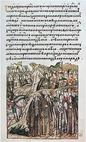 Согласно житию преподобного Сергия Радонежского, перед Куликовской битвой князь Димитрий в поисках духовной поддержки отправился к нему в монастырь за благословением. Татары в то время считались непобедимыми, а имя преподобного Сергия, как праведника и чудотворца, было прославлено по всей Руси. Благословение такого человека должно было вселить надежды во всех воинов. Преподобный Сергий благословил не только князя, но и, согласно автору позднего Сказания о Мамаевом побоище, жившему в XV веке, двух иноков, хорошо знающих военное искусство, Александра Пересвета и брата его Андрея Ослябу[4]. Историк А. Л. Никитин считает, что эпизод с «благословением», скорее всего, является вымышленным, как и сам поединок с «печенегом» Челубеем и иночество Пересвета[5]. В самом раннем известном кратком летописном рассказе ο битве 1380 года «О побоище иже на Дону» имя Сергия Радонежского не упоминается совсем[6].
