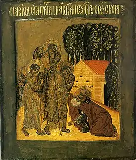 ![]() Явление Святой Троицы преподобному Александру. Икона середины XVII века. Музей-заповедник «Коломенское» | |
