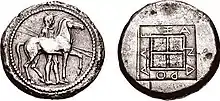 ![]() Серебряная монета македонского царя Александра I. Стала чеканиться после захвата им Бизалтии | |