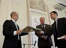 Заместитель председателя Следственного Комитета Российской Федерации А. В. Федоров и Ректор МГЮА, Сопредседатель Ассоциации юристов России В. В. Блажеев вручают С. В. Алексееву и его заместителю В. Ю. Каткову наградное оружие Следственного комитета Российской Федерации - Именное оружие МВД России «За верность Отечеству» — За высокий профессионализм и большие заслуги в защите государственных интересов