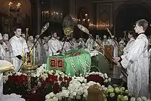 9 декабря после заупокойной литургии, которую возглавил патриарший местоблюститель митрополит Кирилл в сослужении сонма архиереев (служило большинство епископата Русской православной церкви, а также предстоятели и представители иных Поместных церквей – патриархи Константинопольский Варфоломей, Грузинский Илия, Румынский Даниил, архиепископ Афинский и всей Эллады Иероним, архиепископ Тиранский и всей Албании Анастасий, митрополит Чешскиих земель и Словакии Христофор), и отпевания, которое возглавил патриарх Константинопольский Варфоломей, тело усопшего было перевезено в Богоявленский Елоховский собор, где было захоронено в южном (Благовещенском) приделе[76].