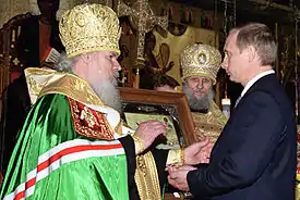 - Святейший патриарх Алексий поздравил Владимира Путина в связи с вступлением его в должность председателя правительства РФ. На официальном сайте МП, 8.5.2008.