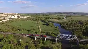 ![]() Рельсовый автобус РА2 прибывает на станцию Алексин. Мост через р. Ока. | |