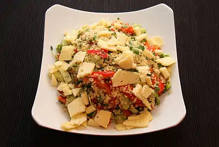 Салат с кускусом, сыром, огурцом и перцем