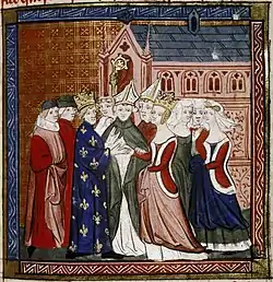 В 1144 году умер папа Иннокентий II. Его преемник, Целестин II, был учеником Бернарда Клервоского и оказался более уступчивым. Бернард понимал, что для мира нужно убедить пойти на уступки Алиенору, сторонники которой отказывались идти на какие-то соглашения, пока не будет снято отлучение с Рауля и Петрониллы и не будет признан их брак. 11 июня 1144 года происходило освящение нового клироса аббатства Сен-Дени, на котором присутствовали король, его мать, Алиенора и прочая знать королевства. Там состоялась встреча Бернарда с Алиенорой, в результате которого был найден компромисс. В «Житии Святого Бернарда» Жоффруа Осерского рассказывается, что Алиенора, брак которой долгое время оставался бездетным (был только один выкидыш), потеряла надежду стать матерью и поведала об этом Бернарду, который пообещал, что если она перестанет дурно влиять на короля, у неё будет ребёнок[12].