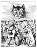 Чеширский Кот (англ. Cheshire Cat) — кот Герцогини, который часто улыбается. Вид у персонажа добродушный, однако у него много зубов и длинные когти. Алиса ласково называла его Чешик и считала своим другом. Сам кот думает, что находится не в своём уме, поскольку (в отличие от собак) ворчит, когда доволен, и виляет хвостом, когда сердится. Он умеет исчезать — как полностью, так и частично, — оставляя только улыбку или голову[К 4]. Во времена Кэрролла в ходу была поговорка: «Улыбается как чеширский кот». Объясняя происхождение поговорки, исследователи выдвинули две теории. Согласно первой, в графстве Чешир некий неизвестный маляр рисовал ухмыляющихся львов над дверями таверн[7]. Согласно второй, чеширским сырам иногда придавали форму улыбающихся котов[8]. «Это особенно в стиле Кэрролла, — утверждает доктор Филлис Гринейкер, — ибо в таком случае можно принять фантастическую идею, что кот из сыра может съесть крысу, которая съела бы сыр!»[5] По другой версии, Кэрролл придумал персонажа под впечатлением вырезанного из песчаника кота на западной стороне церкви Святого Уилфрида в деревне Грэппенхолл[9]. Персонаж отсутствует в ранней версии сказки[5].