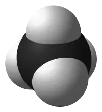Химическая структура (вверху) и 3D-модель (внизу) метана — простейшего алкана |