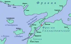 Он отплыл с Самоса на одной триере на Херсонес Фракийский и поселился в собственном замке[76]. Набрав отряд наёмников и завязав дружественные отношениями с фракийскими царями Севтом и Медоком, он начал помогать им в военных походах против неподвластных им фракийцев[77].