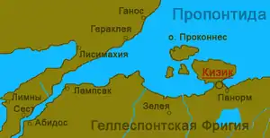 Между тем Миндар и Фарнабаз соединились и расположились в Кизике, а к афинскому флоту присоединились 20 кораблей под командованием Фрасибула и ещё 20 кораблей под командованием Ферамена. На протяжении нескольких лет три флотоводца — Алкивиад, Фрасибул и Ферамен — вели очень успешные действия против спартанцев. О каких-либо разногласиях или конфликтах между ними не сообщается в античных источниках. Видимо, Ферамен и Фрасибул признали Алкивиада верховным руководителем афинского флота[65]. Алкивиад выступил с речью перед воинами, призывая дать сражение «на море, на суше и даже на стенах города». Затем он приказал скрытно выступить к Кизику под проливным дождём. В результате афинский флот отрезал флот Миндара от гавани Кизика. Боясь, что спартанцы отступят, увидев численное превосходство афинских судов, Алкивиад двинулся в атаку с сорока кораблями. В разгаре боя на спартанцев напали и все остальные афинские корабли. Спартанцы стали высаживаться на суше и обратились в бегство. Алкивиад немедленно высадился и преследовал отступающих. В этой резне погиб Миндар, а Фарнабаз сбежал[64]. Спартанцы подверглись сокрушительному разгрому, их флот был уничтожен и захвачен, главнокомандующий погиб. Афиняне заняли Кизик, перебив небольшой спартанский гарнизон. В городе Хрисополь Алкивиад учредил таможню для взимания десятипроцентной пошлины с кораблей, идущих из Чёрного моря в Эгейское[66]. Благодаря этому Афины получили новый источник доходов[67].