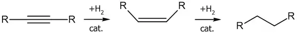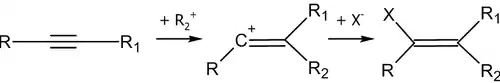 Для алкинов характерны реакции присоединения. В отличие от алкенов, которым свойственны реакции электрофильного присоединения, алкины могут вступать также и в реакции нуклеофильного присоединения. Это обусловлено значительным s-характером связи и, как следствие, повышенной электроотрицательностью атома углерода. Кроме того, большая подвижность атома водорода при тройной связи обусловливает кислотные свойства алкинов в реакциях замещения.