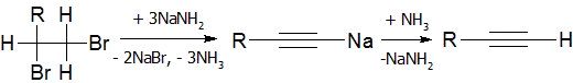 Алкилирование алкинов с концевой тройной связью производится по следующей схеме: