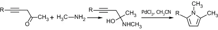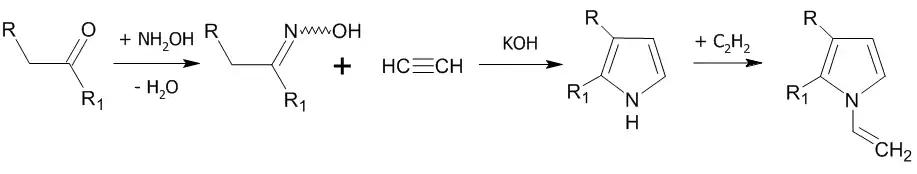 Взаимодействие ацетилена с оксимами кетонов в присутствии супероснования приводит к получению пиррольного кольца (Реакция Трофимова)[26]: