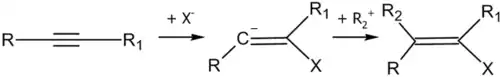 Взаимодействие галогена на монозамещённые ацетилены в щелочной среде приводит к получению галогеналкинов[14]: