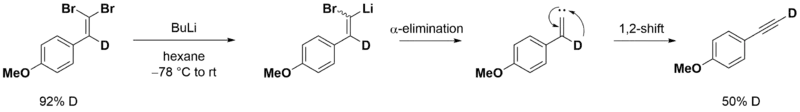 На второй стадии происходит обмен брома на литий и альфа-элиминирование с последующим превращением винилидена в алкин в результате перегруппировки Фрича-Буттенбергера-Вихеля: