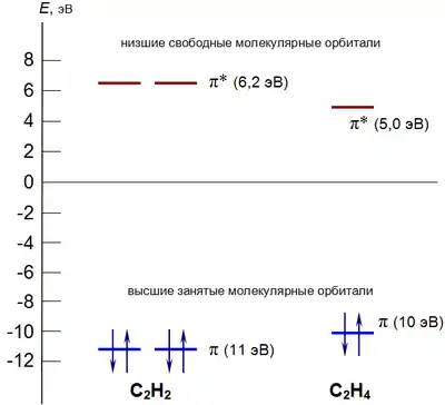 На представленной выше диаграмме приведены молекулярные орбитали этилена и ацетилена.