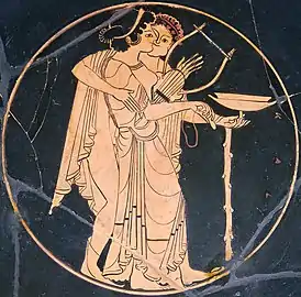 ![]() музыкант, поддерживающий пьяную участницу пира изображение на античной вазе | |