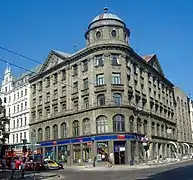 Банковское здание на ул. Калькю, 15 (1913) - первое многоэтажное здание в Риге с монолитным железобетонным каркасом[2].