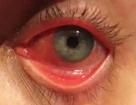 Аллергический конъюнктивит — воспаление в конъюнктиве (мембране, покрывающей белую часть глаза) из-за аллергии.[2] Несмотря на то, аллергены разные среди пациентов, наиболее распространённой причиной является сенная лихорадка. Симптомы включают покраснение (в основном за счёт вазодилатации периферических мелких кровеносных сосудов), отёк в конъюнктиве, зуд и увеличение слезотечения (производство слёз). Если все это в сочетании с ринитом, состояние называется аллергическим риноконъюнктивитом .