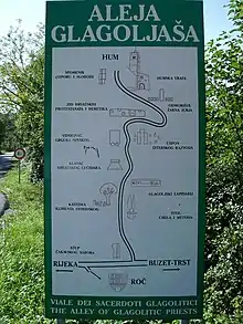 Аллея, протяженностью более 6 км, расположена вдоль дороги, соединяющей самый маленький город в мире Хум с деревней Роч и представляет собой дорогу, по обеим сторонам которой находятся скульптуры в виде письмен на глаголице.